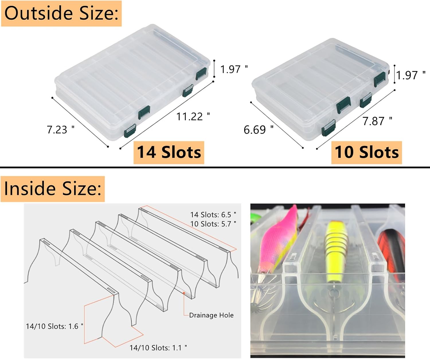 With 14 slots on each side, this double-sided tackle box offers ample space to store a variety of fishing essentials. Whether you're carrying squid jigs, minnows, or various hooks, this versatile container has you covered. The individual compartments are perfect for keeping your items separated and preventing tangling or damage.